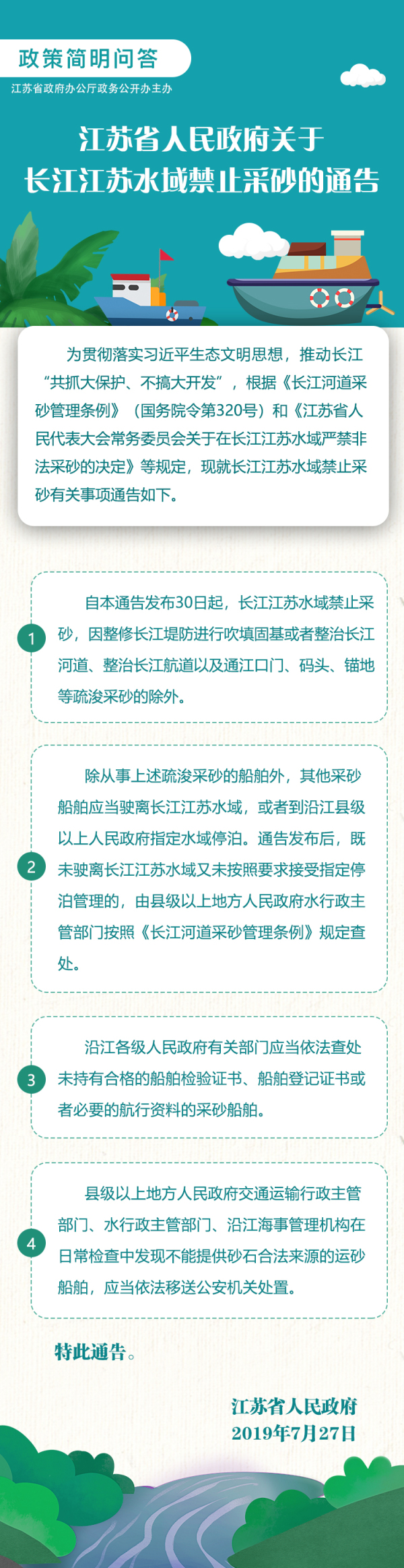 关于长江江苏水域禁止采砂的通告