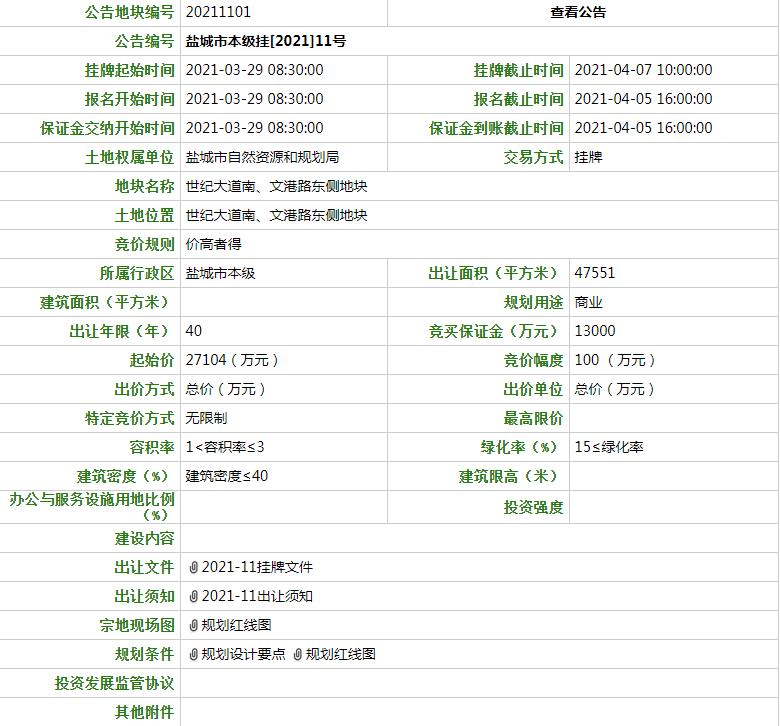 五、本次国有建设用地使用权实行网上挂牌出让,通过盐城市本级 国有建设用地使用权网上交易系统( http://www.landyc.com )(以下简称网上交易系统)进行。 符合报名资格条件的竞买申请人可于2021年03月29日 起至2021年04月05日登录网上交易系统提交申请。缴纳竞买保证金的截止时间为 2021年04月05日16时。