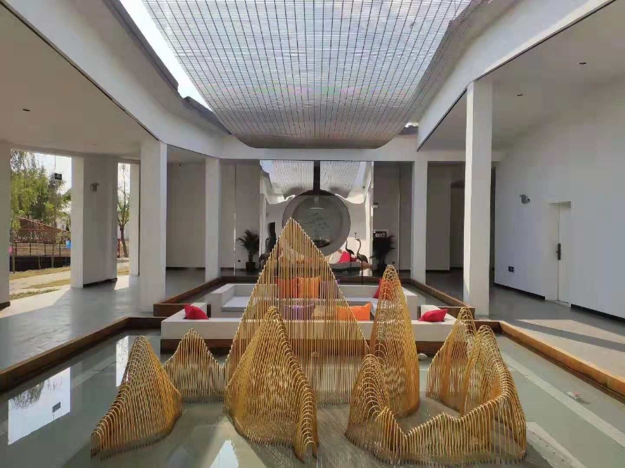 丹顶鹤的东方文化特质、高贵优雅的气质在国画中更显神韵。因此,鹤影里的建筑形态借鉴国画中的笔触感,勾勒出简洁的屋顶曲线形态。这种曲线造型通过采用二次钢结构进行找坡放线,使其更具可塑性。突出展现这一建筑特色的,就是屋顶造型折叠连绵的爱鹤学馆,其鹤舞翩翩的韵味与周边改建的二层楼房的斜屋顶形成乡土印象的呼应。用现代建筑的构造形式创新演绎乡土性特色,给观者带来一种既陌生又熟悉的亲切感。