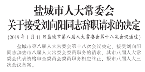 盐城市人大常委会关于接受刘向阳同志辞职请求的决定
