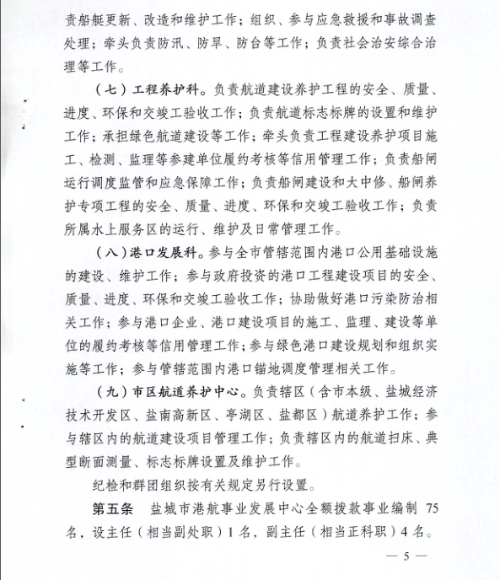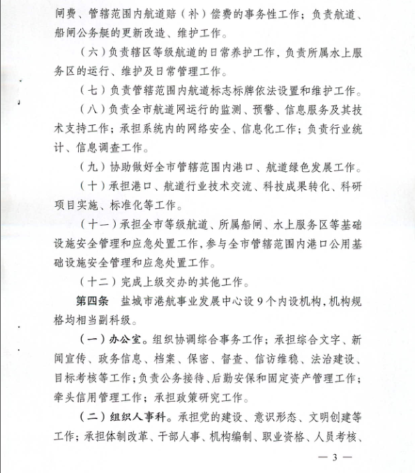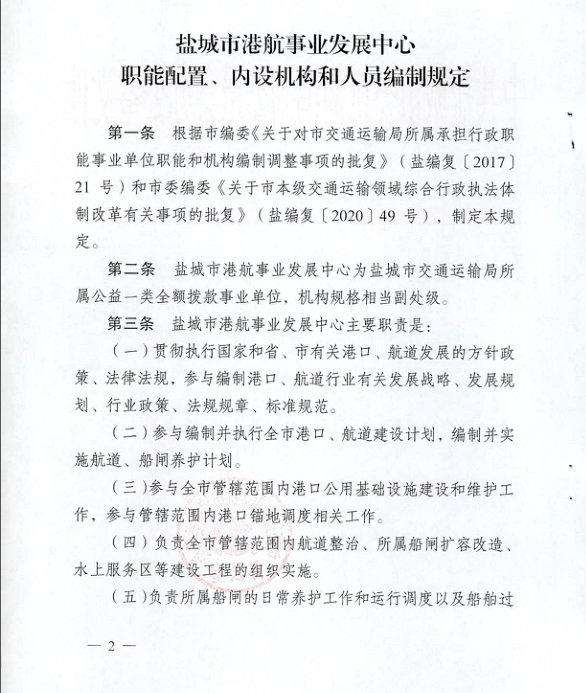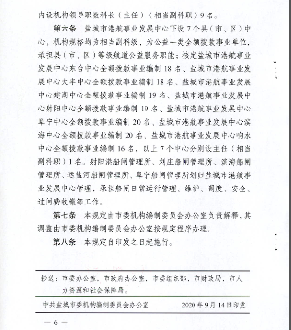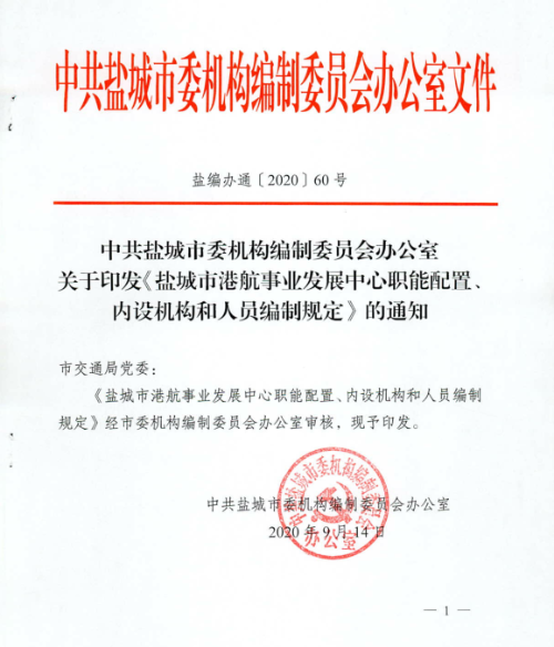 中共盐城市委机构编制委员会办公室关于印发《盐城市港航事业发展中心职能配置、内设机构和人员编制规定》的通知