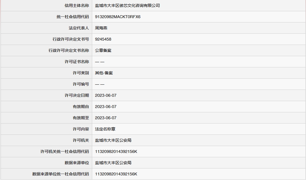 关于对盐城市大丰区彼芯文化咨询有限公司的公章备案许可