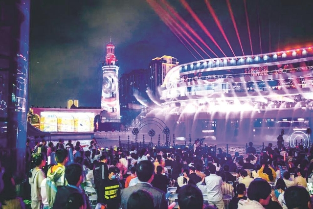 夜色降临,伴随着灯光和阵阵惊叹声,3D光影大秀《又见串场河》拉开了活动的序幕。美轮美奂的幻影以水、岸、桥、廊为幕,以光影为笔,结合水幕喷泉在浪漫的星空下变幻出盐南的各大标志性建筑,以及如新生儿般活力四射的串场之眼。深情而富有哲理的画外音,带领着市民及游客身临环抱式的沉浸空间,看见千年串场的崭新风貌,开启了一场印象深刻的城市之旅。