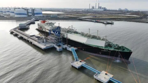 10월 28일 오전 11시, 중국이 독자적으로 설계·건조한 17만4천㎥급 LNG 운반선 ‘뤼넝싱(绿能星)’호가 옌청항 빈하이항구에서 성공적으로 첫 출항하여 싱가포르로 향했다.