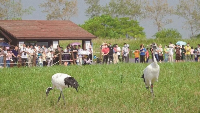 纪录片里的丹顶鹤在盐城丹顶鹤湿地生态旅游区飞进现实,小鹤课堂看野化训练,登上观鸟塔用望远镜追随候鸟的翅膀。